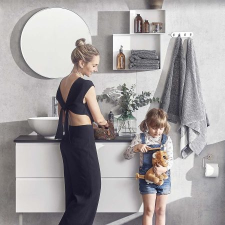 Kylpyhuoneryhmä Viola etusarjoilla, kulhoaltaalla, seinällä valkeat Leiju-hyllyköt