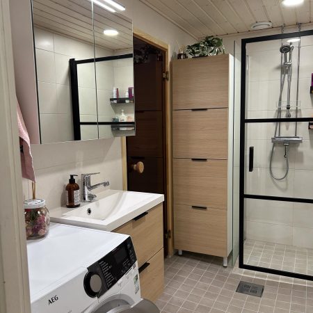 Ovimalli: Laminaatti H3157 Vaalea tammi, syysuunta vaakaan + peiliovet molemmin puolin peilipinta altaan yläpuolella Vetimet: Profiilivedin Lungo, musta Allas: Clever 600C, valumarmori valkoinen