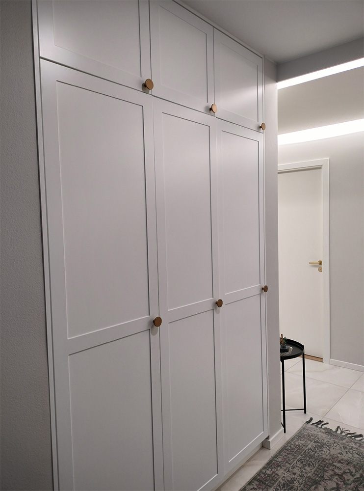 Ovimalli: Laminaatti H3157 Vaalea tammi, syysuunta vaakaan + peiliovet molemmin puolin peilipinta altaan yläpuolella Vetimet: Profiilivedin Lungo, musta Allas: Clever 600C, valumarmori valkoinen