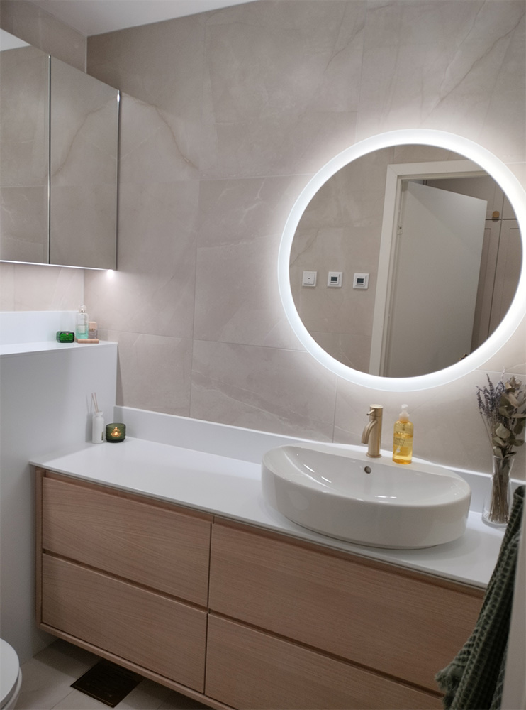 Ovimalli: Akaasia valkea kiiltävä, taso laminaattia, allas Luoto ja valopeili ”aurinkona”