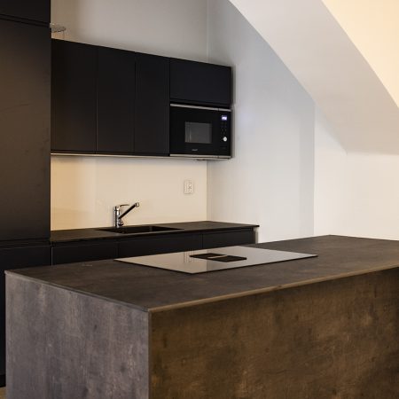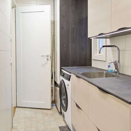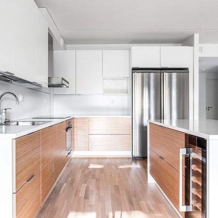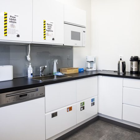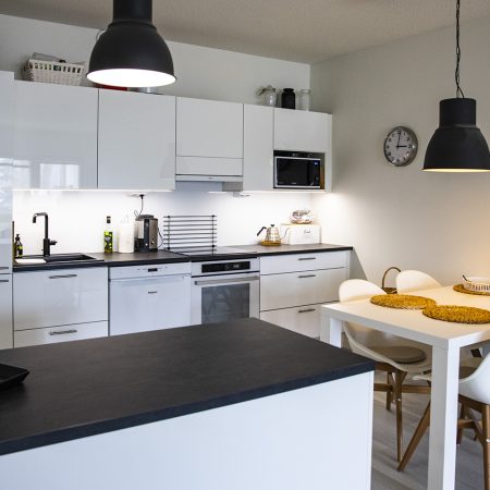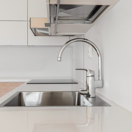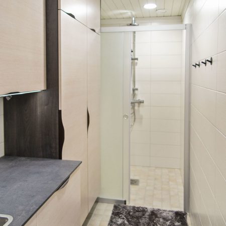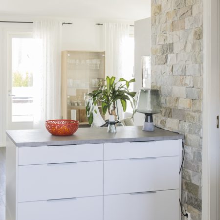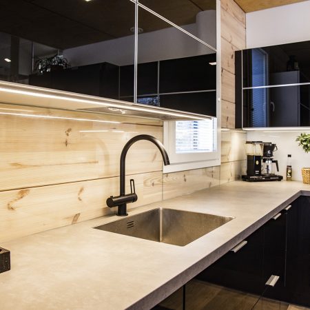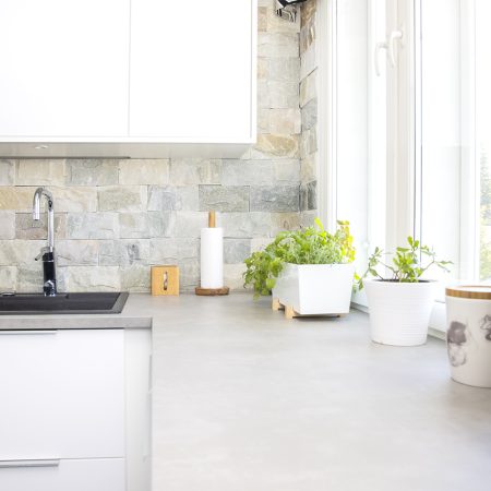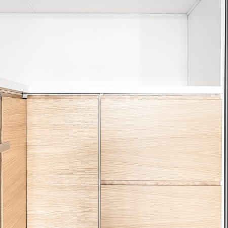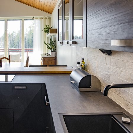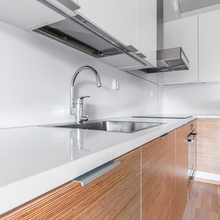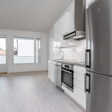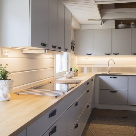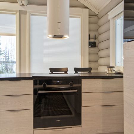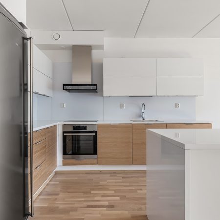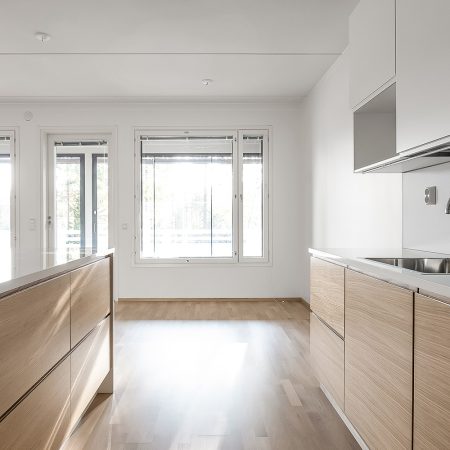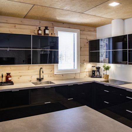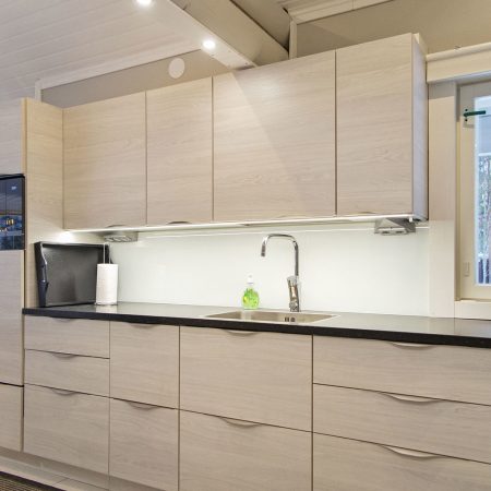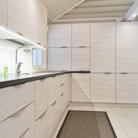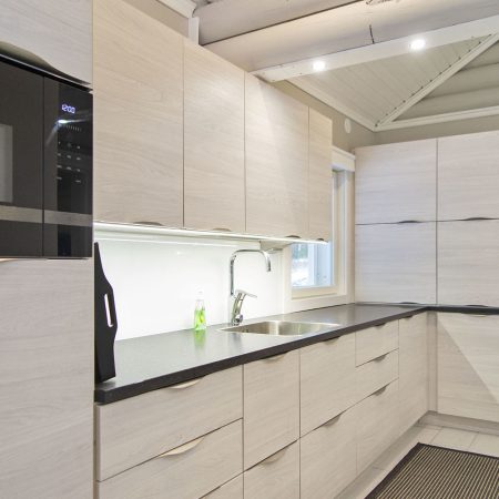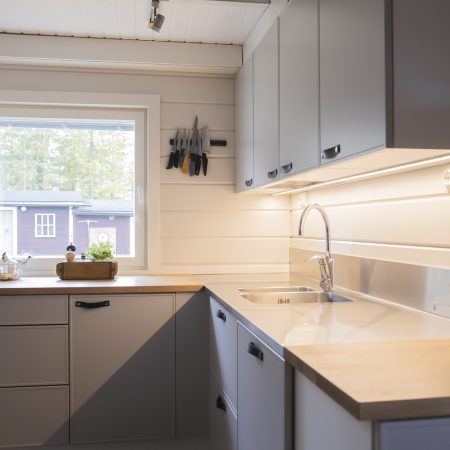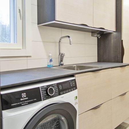 seinäkaappien ovet Aaria valkea Lungo vetimellä, alovet Tekninen koivuviilu Lungo vetimellä, tasot valkea kiiltävä laminaatti, tausta Aluco, allas Stala Lagom