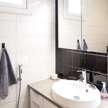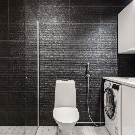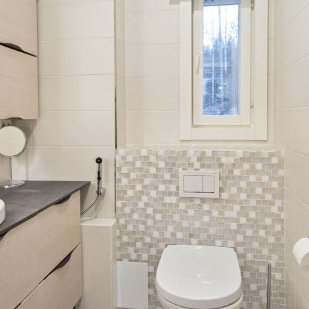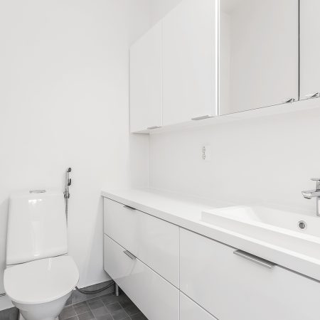 Wc toteutettu kokonaan valkeilla materiaaleilla, allas Clever