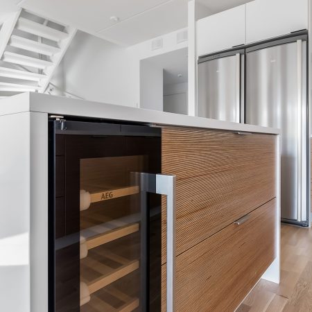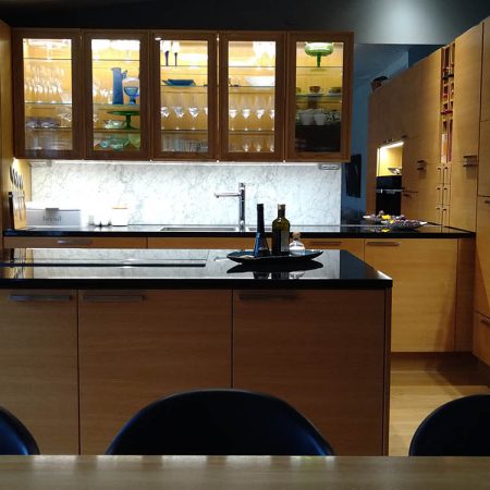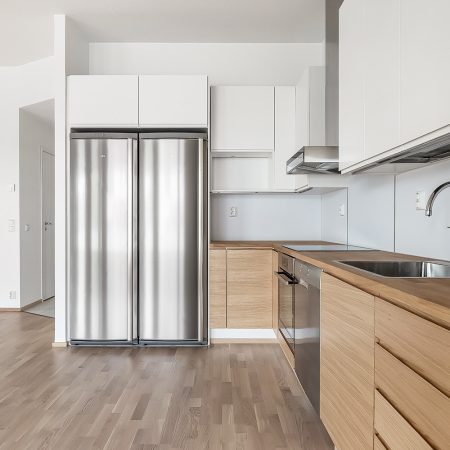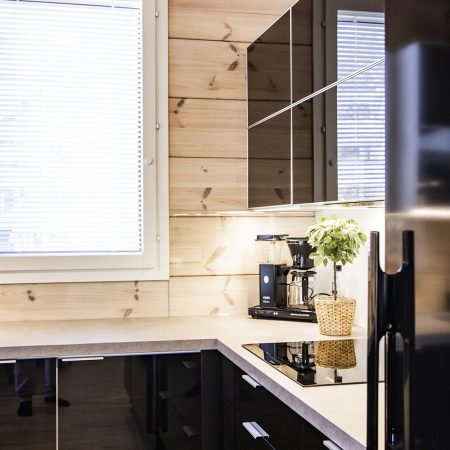 Yläovet Aaria valkea mdf Lungovetimellä, alaovet tekninen viilu koivu Lungo vetimellä , tasot valkea kiiltävä laminaatti.