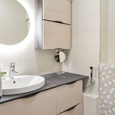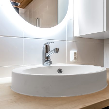 Ovimalli: Akaasia valkea kiiltävä, taso laminaattia, allas Luoto ja valopeili ”aurinkona”