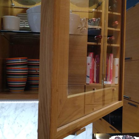 Yläovet valkea Rumba , alaovet Daalia tammi viilu lakattu, tasot valkea kiiltävä laminaatti, välitila Aluco